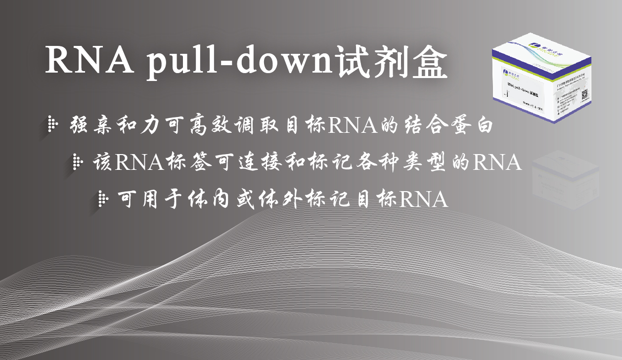 RNA pull-down是檢測(cè)RNA及其結(jié)合蛋白(RNA binding protein,RBP)之間相互作用的主要實(shí)驗(yàn)手段之一。生物素-RNA pull down試劑盒利用體外轉(zhuǎn)錄的生物素標(biāo)記RNA來模擬天然RNA分子,作為探針,與樣本裂解液孵育,探針與裂解液中的蛋白形成RNA-蛋白質(zhì)復(fù)合物;通過鏈霉親和素磁珠與生物素之間的強(qiáng)親和力,特異性捕獲生物素標(biāo)記的RNA,從而實(shí)現(xiàn)RNA結(jié)合蛋白(RBPs)的捕獲富集;之后可以采用Western Blot技術(shù)檢測(cè)特定蛋白,也可以采用質(zhì)譜(LC-MS/MS)技術(shù)鑒定未知蛋白。