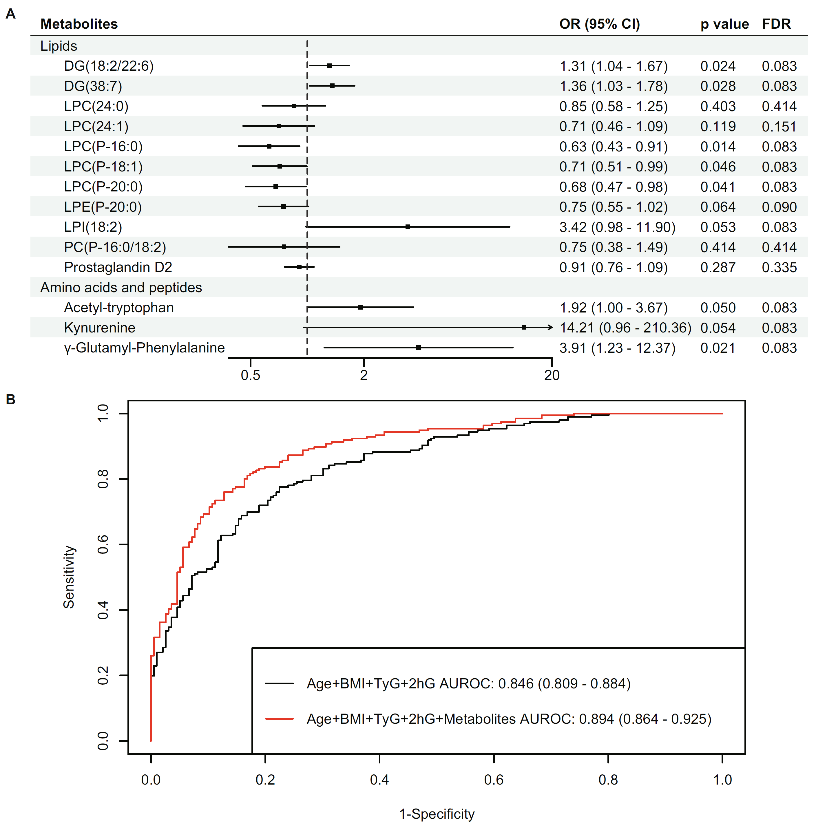 機(jī)器學(xué)習(xí)分類器選擇了14個(gè)能夠?qū)⒂蠺2D的個(gè)體與沒有T2D的個(gè)體區(qū)分開來的代謝特征,將其逐一納入條件logistic回歸模型中,該模型根據(jù)年齡、性別、BMI、TyG指數(shù)、腰臀比、2hG、胰島素和HDL/LDL比進(jìn)行了調(diào)整。在這14種代謝產(chǎn)物中,乙酰色氨酸、犬尿氨酸、c-谷氨酰-苯丙氨酸、DG(18:2/22-6)、DG(38:7)、LPI(18:2)與T2D風(fēng)險(xiǎn)呈獨(dú)立正相關(guān)(q<0.1),而LPC(P-16:0)、LPC(P-8:1)、LPC(P-20:0)、LPE(P-20:00)與T2D風(fēng)險(xiǎn)呈負(fù)相關(guān)(圖6A)。
